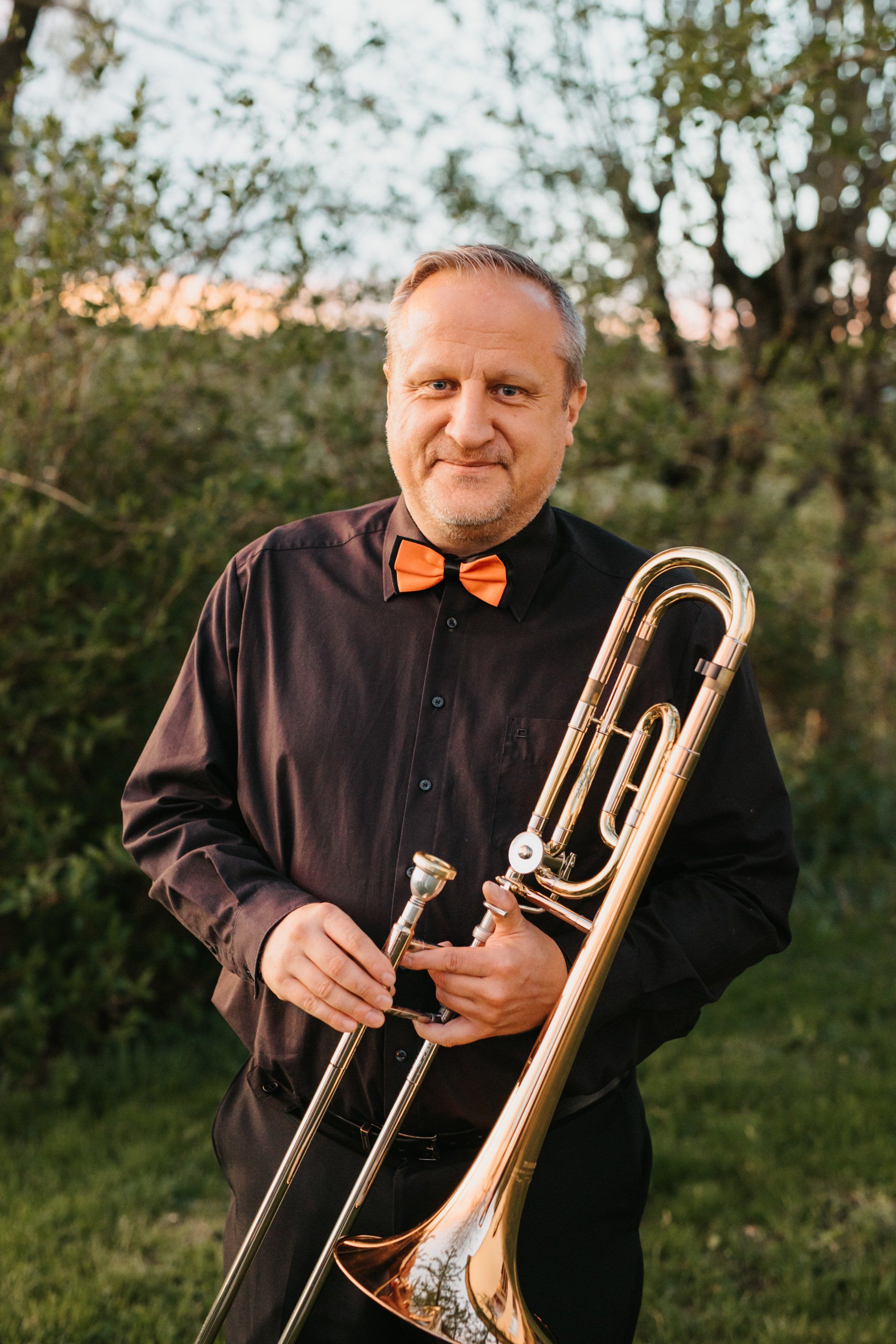 Schwer zu glauben, sein Gewicht beruht hauptsächlich auf schweren Knochen. Mit 11 begann er seine Ausbildung an der Posaune im Musikverein Bleichheim. Vom damaligen Dirigenten, dem Klarinettisten Karl Rombach ausgebildet, behauptet er noch heute von sich im würden symphonische Triller mehr liegen als Glissandi. Nach seiner doch eher klassischen Ausbildung und einigen Irrungen und Wirrungen suchte er nach eigenen Angaben eine Symbiose zwischen traditioneller Blasmusik und Free Jazz, einer weiteren großen Leidenschaft von ihm. Er glaubt diese in der Soul Musik, respektive dem Brass Ensemble gefunden zu haben. Mit dieser Meinung steht er selbstverständlich innerhalb der Gruppe ziemlich alleine da, aber wenn es Ihm hilft, und er Brassomanie nicht zu einer Punktband umfunktionieren will, wollen wir ihn im Glauben lassen... Neben einer langen Liste von Stationen seines Schaffens wie z.B. das SWR 4 Blasorchesters spielt er heute noch bei “Soul’s Back in Town“ und der “Bubetäler Partyband“. Als Aushilfe in Vereinen ist er immer gerne gesehen. Nur Vereinsrechner legen oft ein Veto ein. Die Unterhaltskosten nach Proben und Konzerten seien doch extrem hoch. Das hat er wohl mit Hornisten und Trompetern gemein. Neben seinem Hauptinstrument versucht er sich außerdem an allerlei artverwandten Tonerzeugungsmedien wie Bassflügelhorn, Euphonium, Alphorn und seiner heimlichen Leidenschaft der Cowbell. Was das für Rückschlüsse auf seine Psyche schließen lässt überlassen wir den Fachleuten. Bei Brassomanie ist er nach eigenen Angaben weil es mehr Spass macht gemeinsam zu üben, und er die gesamte Band eingeschlossen die aus Nordweil stammenden einfach gut leiden kann.